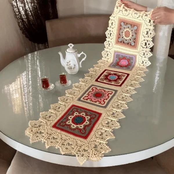 El Yapımı Motifli Dantel Runner | 30x120 cm Örgü | Renkli Masa Örtüsü